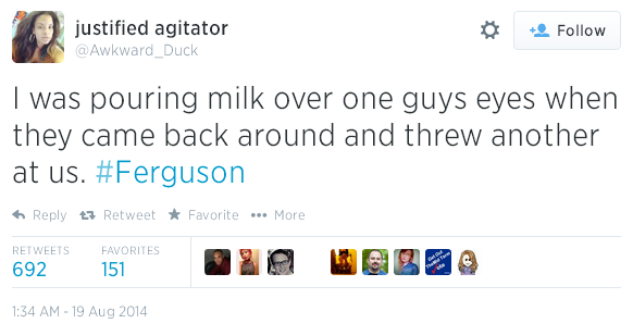 1:34 AM: I was pouring milk over one guys eyes when they came back around and threw another at us. #Ferguson