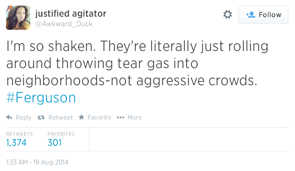1:33 AM: I’m so shaken. They’re literally just rolling around throwing tear gas into neighborhoods-not aggressive crowds. #Ferguson