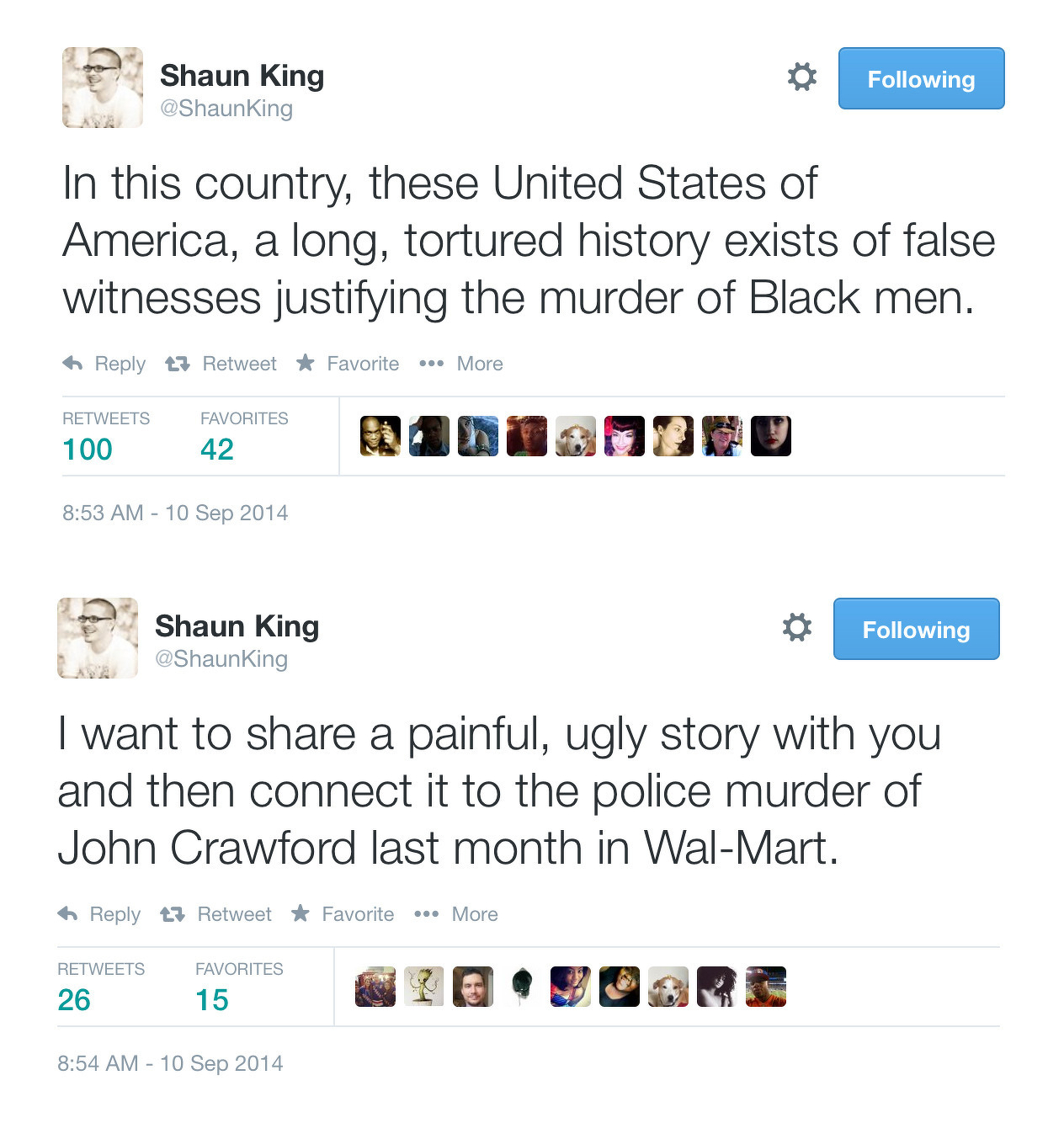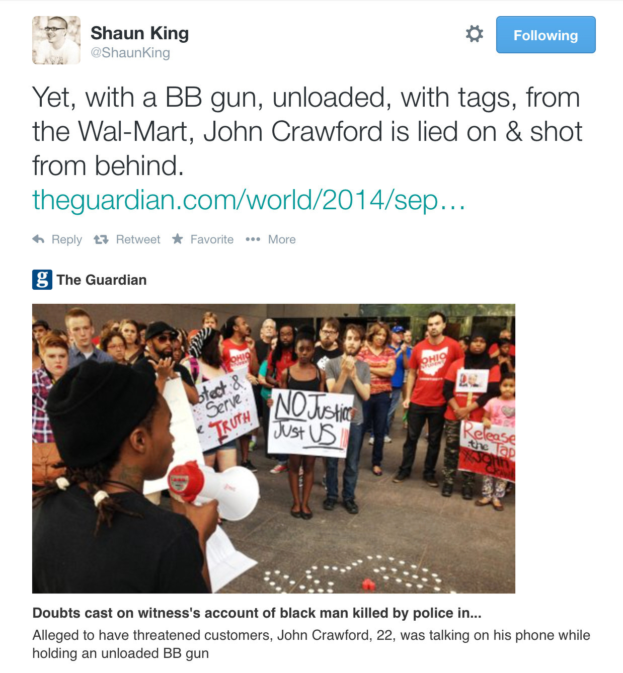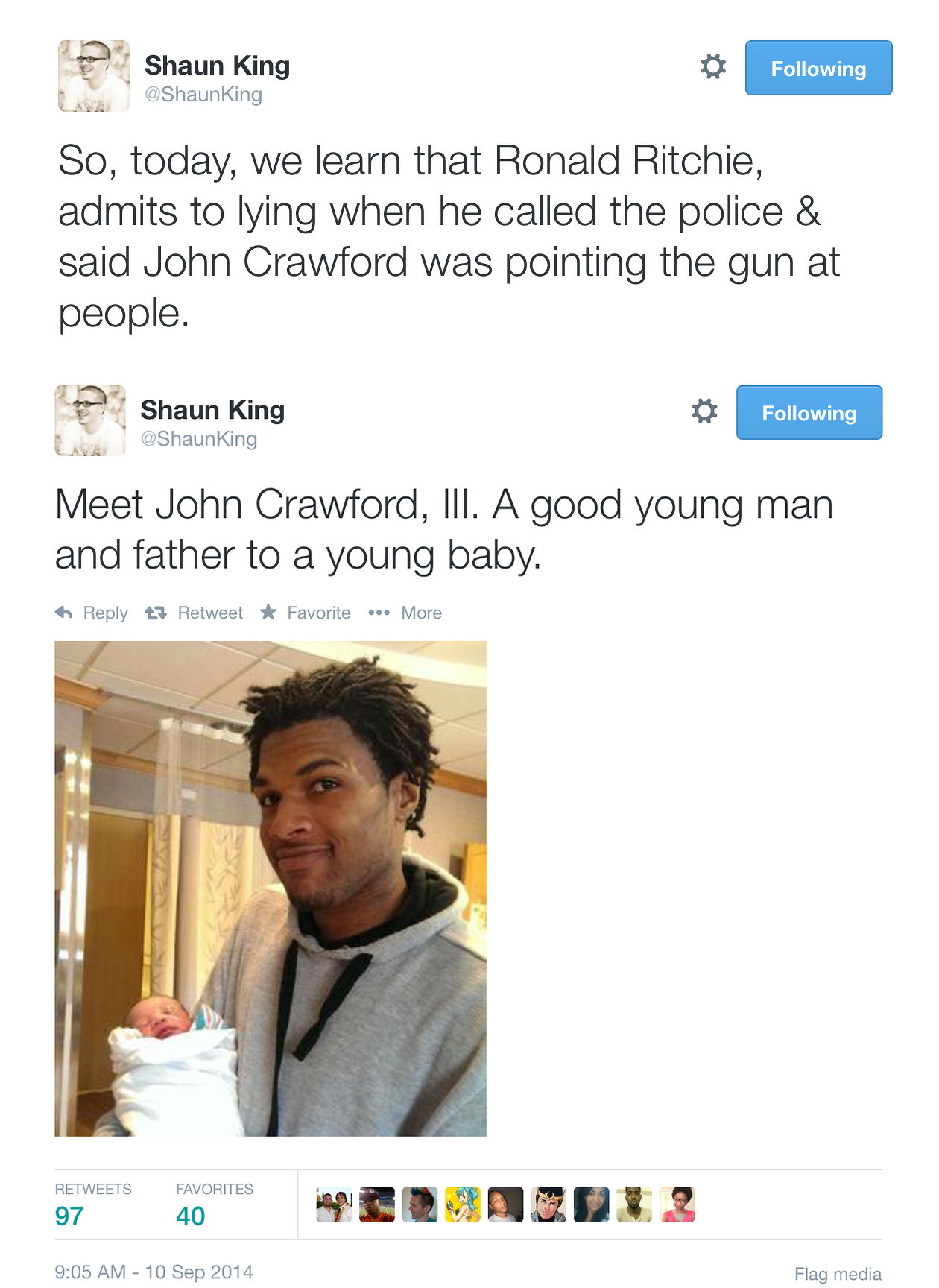 While there is a lot of appropriate rage about Ferguson right now, the killing of John Crawford, III is getting less attention than it deserves. I put Shaun King’s tweets and history lesson on the matter in chronological order for easier consumption.