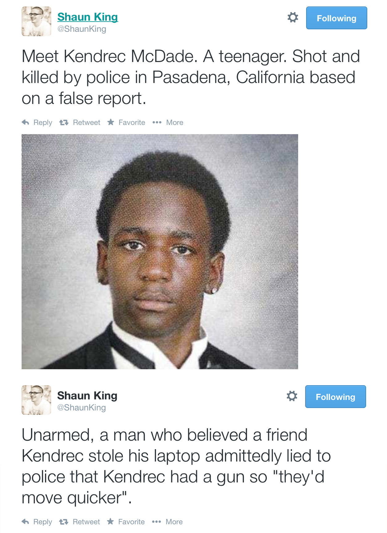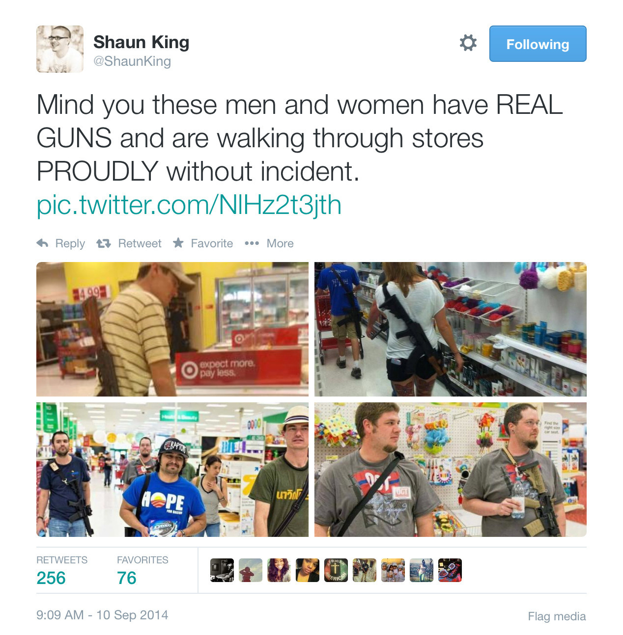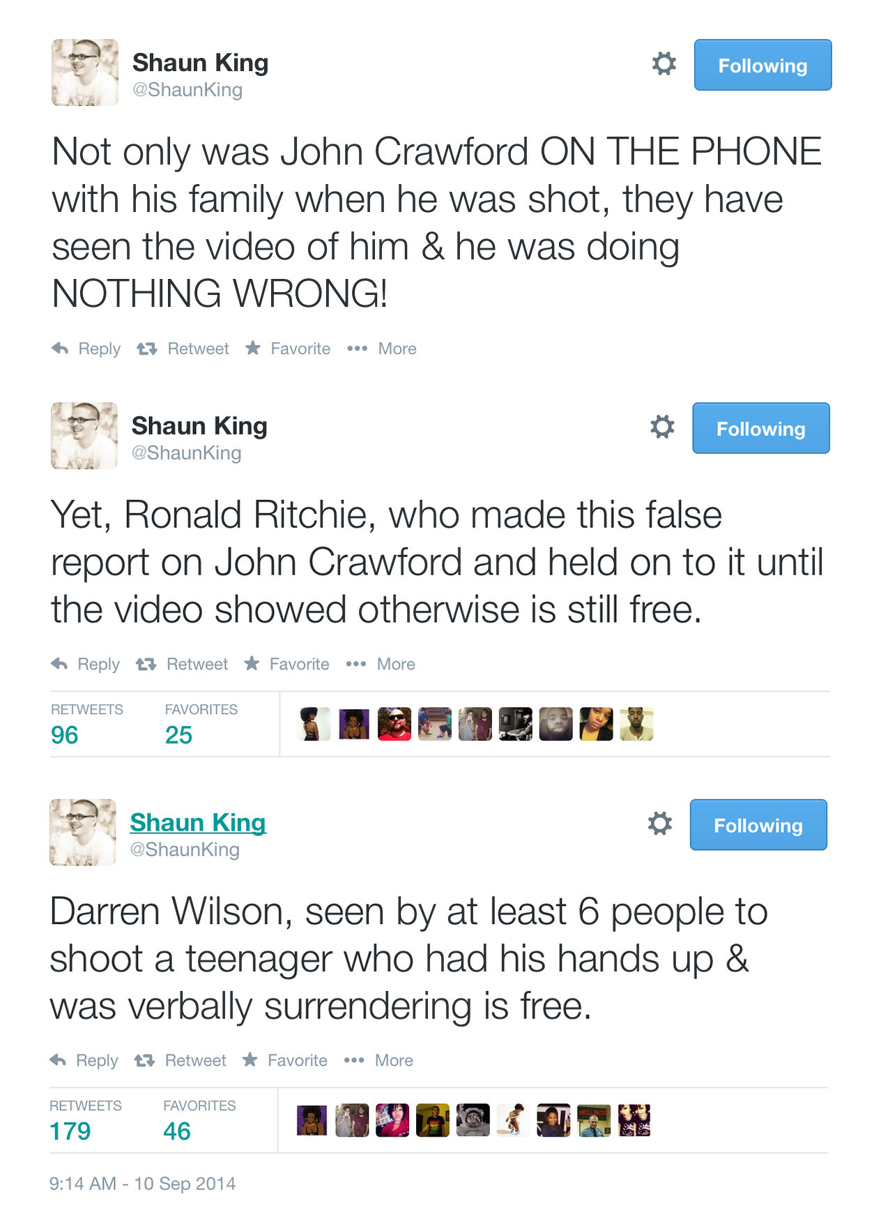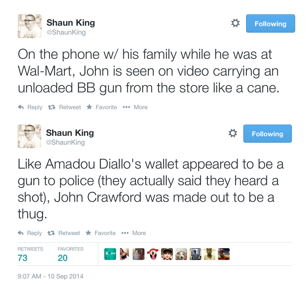 While there is a lot of appropriate rage about Ferguson right now, the killing of John Crawford, III is getting less attention than it deserves. I put Shaun King’s tweets and history lesson on the matter in chronological order for easier consumption.