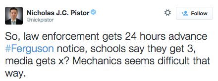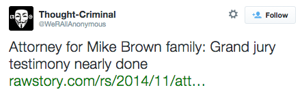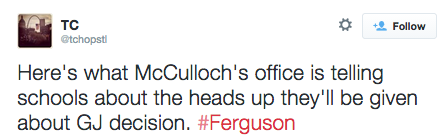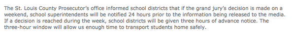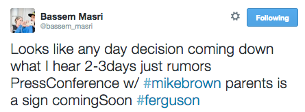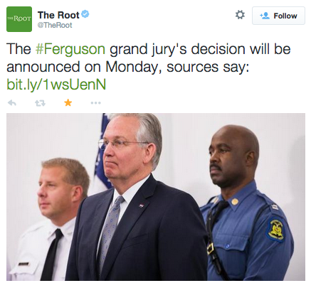 Ferguson Update (11/13/14): Looks like the Grand Jury will be wrapping up within the next 48 hours, with a decision to be announced in the following days. All signs point to early next week. #staywoke #farfromover