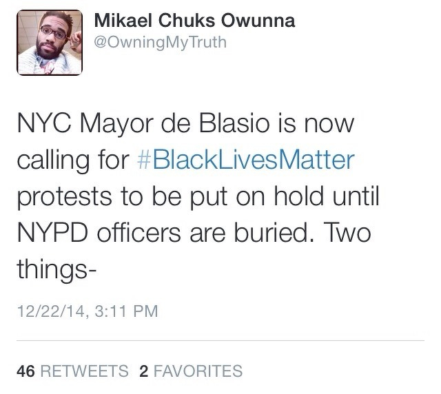 @OwningMyTruth: NYC Mayor de Blasio is now calling for #BlackLivesMatter protests to be put on hold until NYPD officers are buried. Two things-