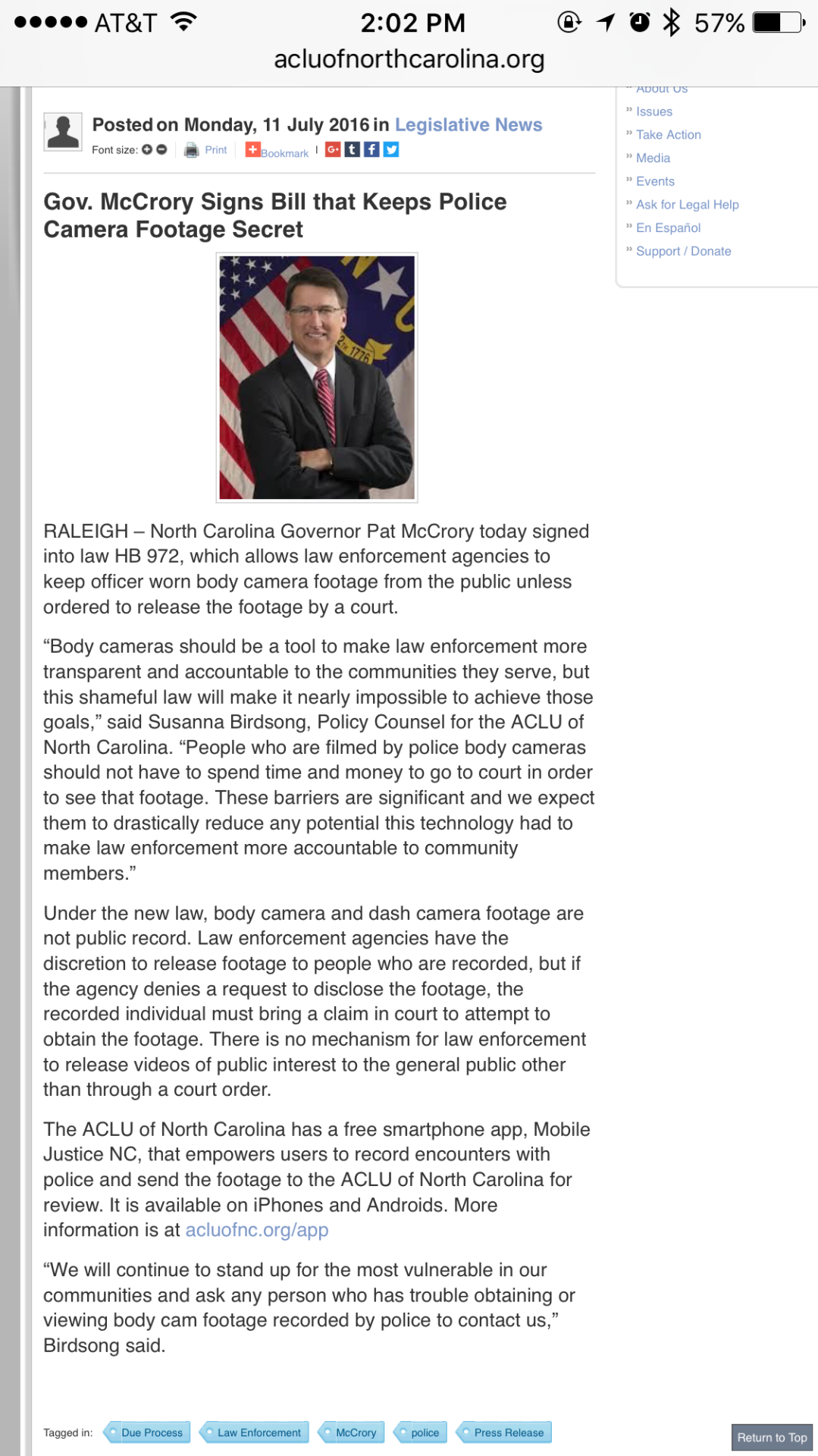“Body cameras should be a tool to make law enforcement more transparent and accountable to the communities they serve, but this shameful law will make it nearly impossible to achieve those goals,” said Susanna Birdsong, Policy Counsel for the ACLU of North Carolina. “People who are filmed by police body cameras should not have to spend time and money to go to court in order to see that footage. These barriers are significant and we expect them to drastically reduce any potential this technology had to make law enforcement more accountable to community members.”